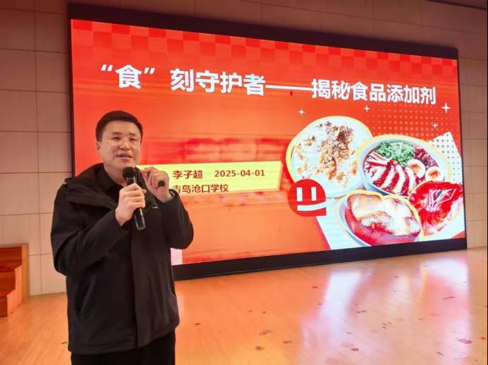 在活动中,青岛沧口学校聘请李子超为学校科学副校长,李子超为300余名学生带来了题为《食刻守护者——揭秘食品添加剂》的科普讲座,受到学生们的热烈欢迎。