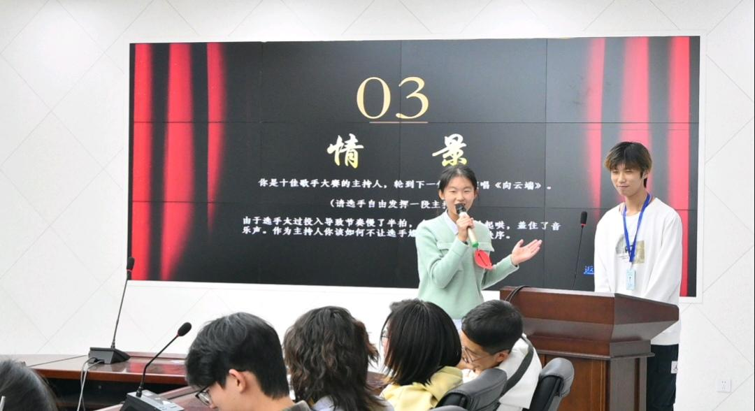 选手根据抽中的一个台上突发状况模拟题,来做出相应的处理,这一环节我们看到了选手们的超强的随机应变能力,也看到了他们在未来作为主持人的无限潜力。