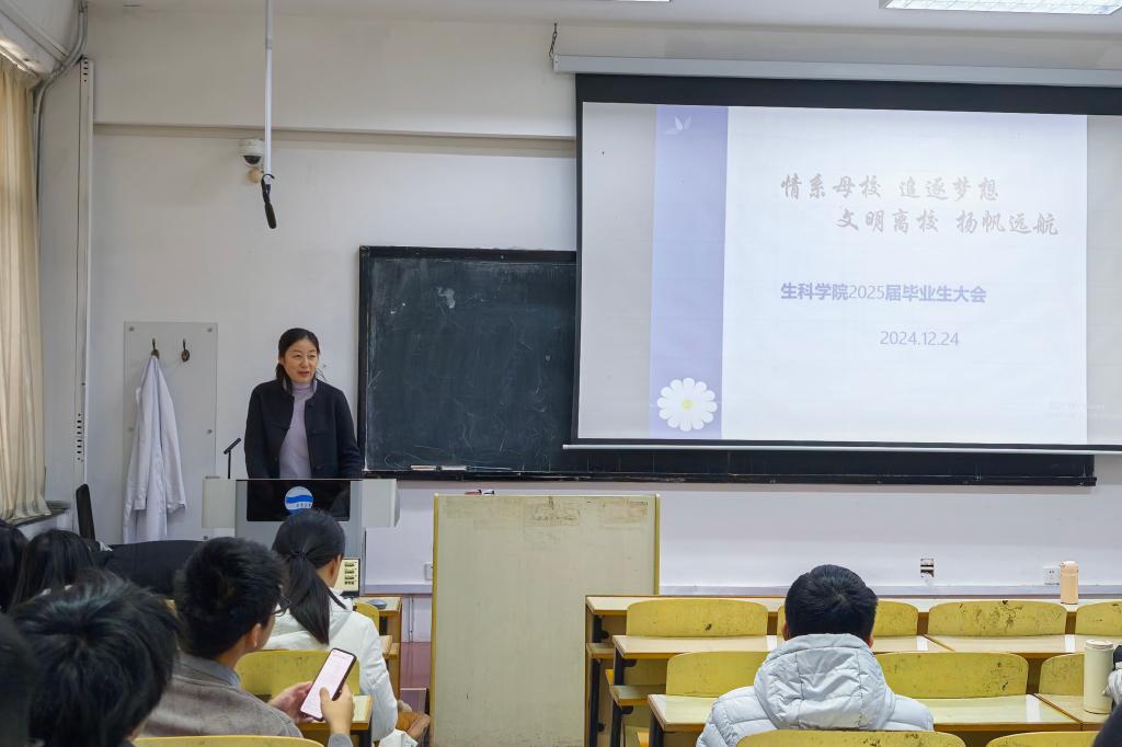 张雪蕾分享当前的考研、就业形势,向同学们明确毕业前各项事宜的时间安排及注意事项,并强调了安全问题。