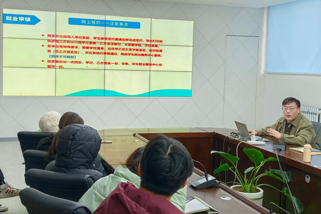 马国成向同学们讲解“山东省高校毕业生就业信息网”中相关内容的填写方式及注意事项,并细致解读《青岛大学“第二课堂成绩单”制度实施办法》。